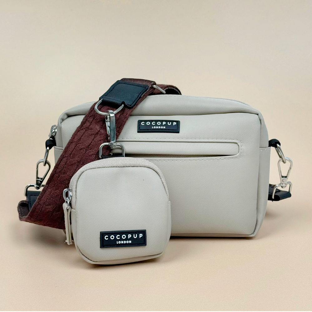 Our Bag Bundle includes: Bag, Treat Pouch with Hot Coco Cable Knit Bag Strap (with inbuilt poop bag dispenser!)