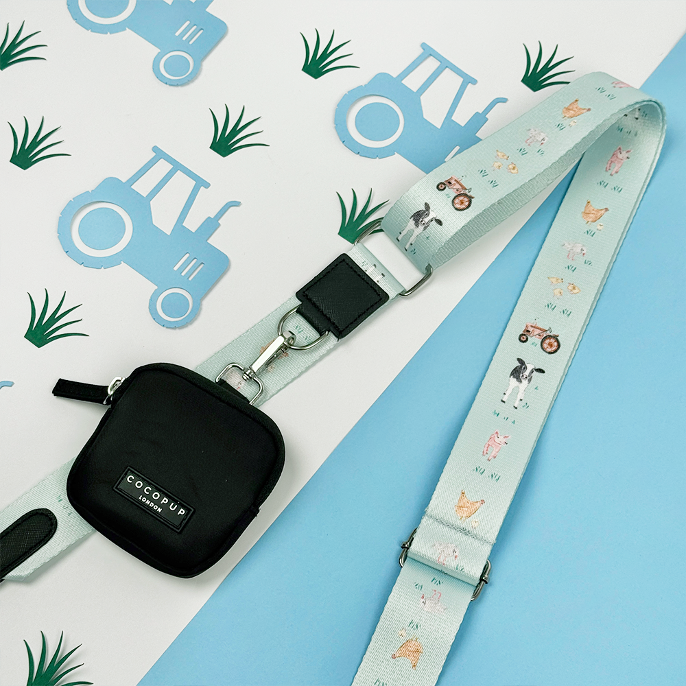 Get ready for countryside adventures with this charming dog walking bag! The blue strap features delightful illustrations of tractors, cows, pigs, ducks and chickens. Perfect for those who adore rural life! With its interchangeable strap, you can switch up your style whenever!
