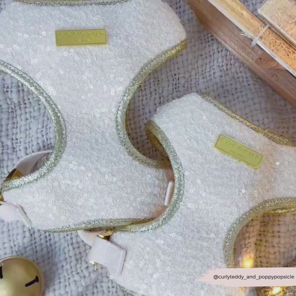 Make every dog walk a dazzling event with the Limited Edition Sparkle Season Gold Adjustable Neck Harness. Featuring glittering gold sequins and a glitter trim, this harness ensures your pup stands out wherever you go. Its adjustable design delivers a comfy fit while adding a burst of sparkle to your furry friend’s day. Perfect for spreading joy and catching every eye on your strolls!