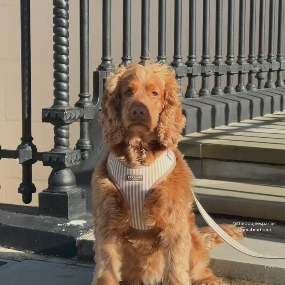 Brown and beige striped dog harness with 'Cocopup London' logo.