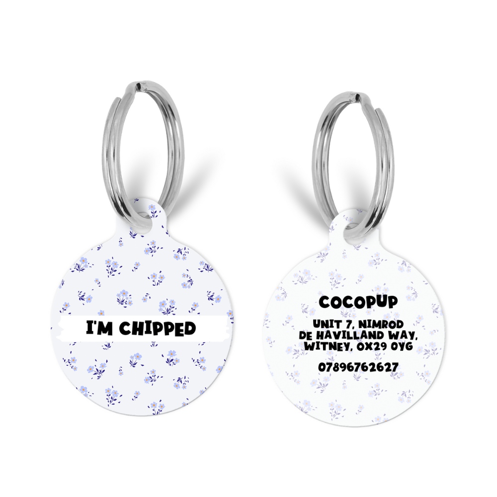 The dog ID tag is double sided, the front features our Ditsy Floral Periwinkle design with the option to add your own personalised text on the front. On the back we can print key important information such as your last name, address and phone number.